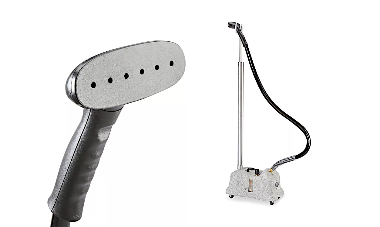 The Jiffy® J-4000 Commercial Garment Steamer (H-4474) is designed for heavy-duty use in department stores and dry cleaners. It smooths and revives dresses, gowns, drapes, and tablecloths with a 1,500-watt heating element, a 5.5-foot flexible hose, and 360° swivel casters for mobility. Features include auto shut-off for safety and all-day operation capability.