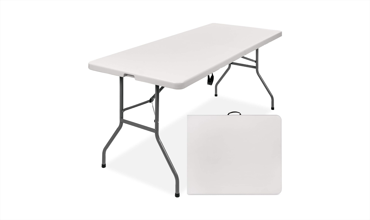 These 4-foot and 6-foot folding tables support up to 220 and 330 pounds respectively, featuring a foldable design with safety buckles and handles for easy storage and portability. Require no assembly.